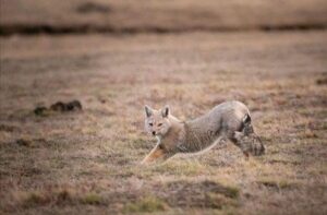 Zorro en el campo Morro Chico de la familia Gallie en Santa Cruz. La implementación de herramientas no letales para el control de la depredación permite este tipo de encuentros. Crédito: Celine Frers.