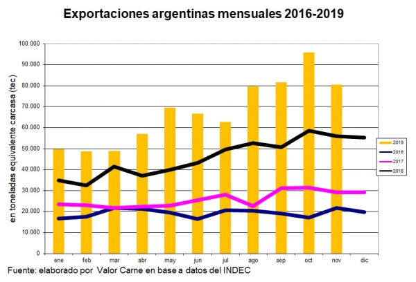 En noviembre, las exportaciones argentinas totalizaron 80 mil toneladas equivalente carcasa (tec), 15 mil menos que el récord de octubre y 25 mil más que un año atrás.