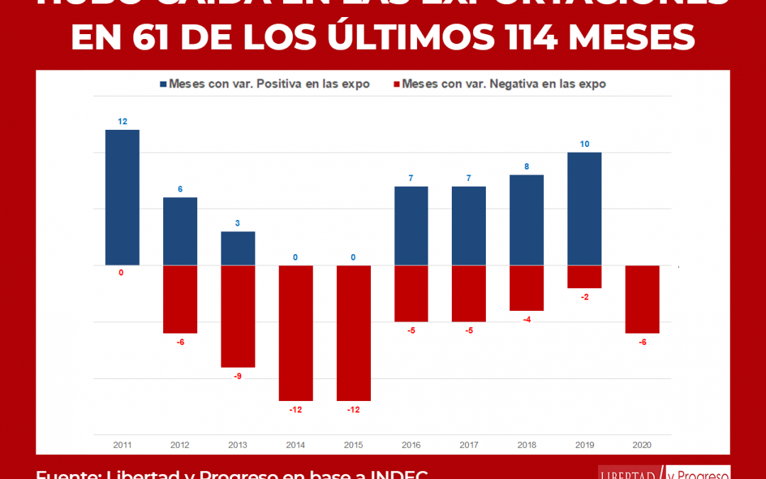Lo cierto es que la tendencia en el deterioro de las exportaciones ya existía, lo único que hizo la Pandemia fue agravar una situación ya existente. De los últimos 114 meses, Argentina obtuvo caída de sus exportaciones en 61 de ellos; es decir, el 54% del total de los meses. Por lo tanto, el problema es estructural y no producto del Covid-19.