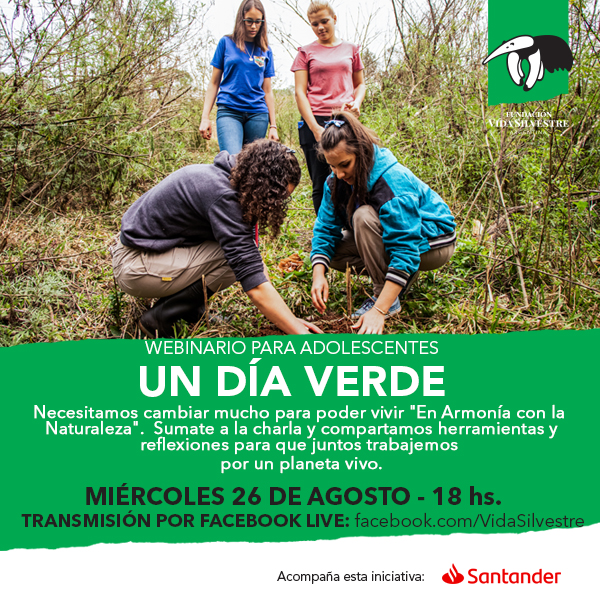 Buenos Aires, 23 de agosto (PR/20).- Fundación Vida Silvestre Argentina, con el apoyo de Santander, presenta un nuevo ciclo de charlas virtuales para adolescentes. La primera de ellas se denomina “Un día verde” y se desarrollará el miércoles 26 de agosto a las 18h de forma totalmente gratuita a través de la página de Facebook de la organización.