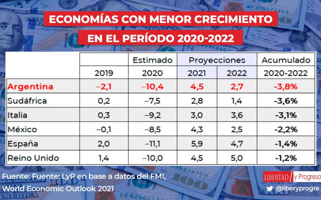 Las restricciones por pandemia afectaron significativamente a casi todo el mundo. A pesar de ello hay enormes diferencias. Algunos países sufrieron caídas muy superiores en sus PBI. En esta lista se encuentran los países desarrollados que en promedio arrojarían caidas del 4,9%, según el World Economic Outlook de enero de 2021 del Fondo Monetario Internacional. Argentina por su parte caería 10,4%, con el agravante de ser un país de ingresos medio-bajos. El organismo espera que el crecimiento acumulado del trienio 20-22, sea negativo en -3,8%.