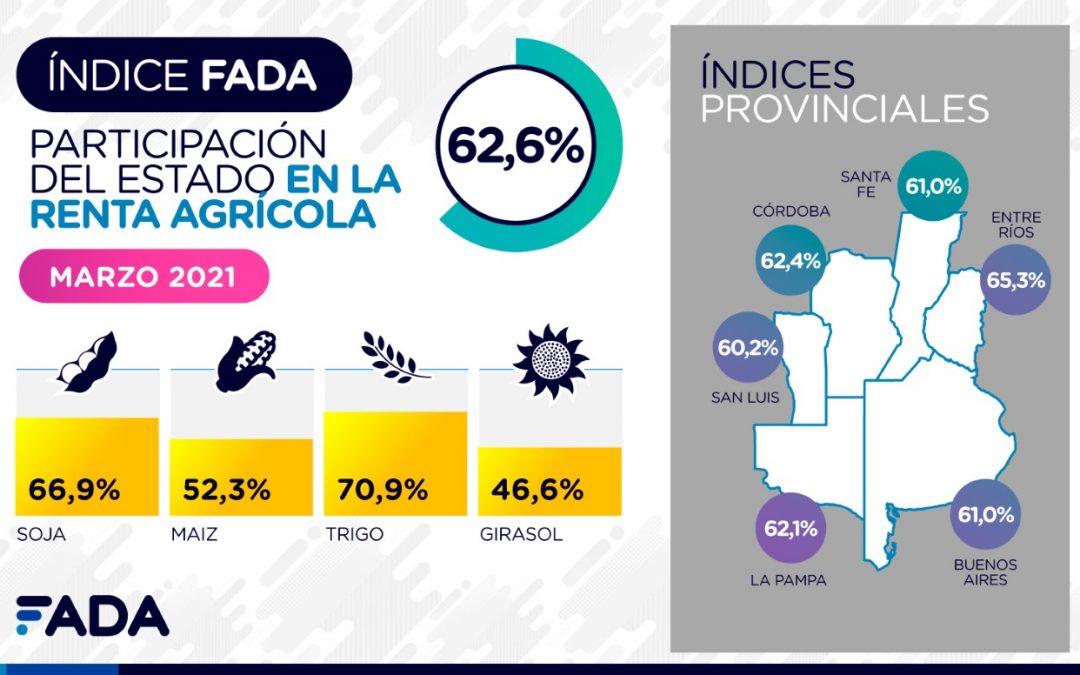 Buenos Aires, 30 de marzo (PR/21) .– FADA (Fundación Agropecuaria para el Desarrollo de Argentina) dio a conocer su Índice trimestral: de cada $100 de renta que genera por hectárea un productor agrícola, $62,60 es lo que representan los distintos impuestos.