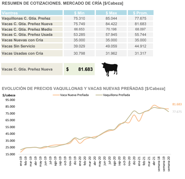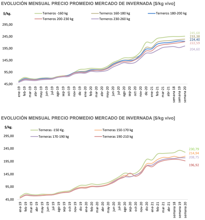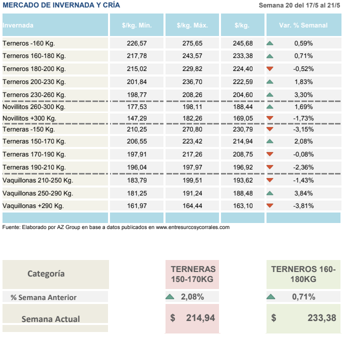 Buenos Aires, 22 de mayo (PR/21) .– Hasta el día martes los precios de la invernada estaban en torno 234 $/kg, el del macho de 170 kg, subiendo un 0,8% respecto a la semana anterior. A partir del miércoles y por los próximos diez días hay un cese de comercialización, muchos remates han sido cancelados por lo cual en los próximos días tendremos poca información. Por el lado de los vientres, la vaquillona preñada promedió en torno a los $ 82.000.