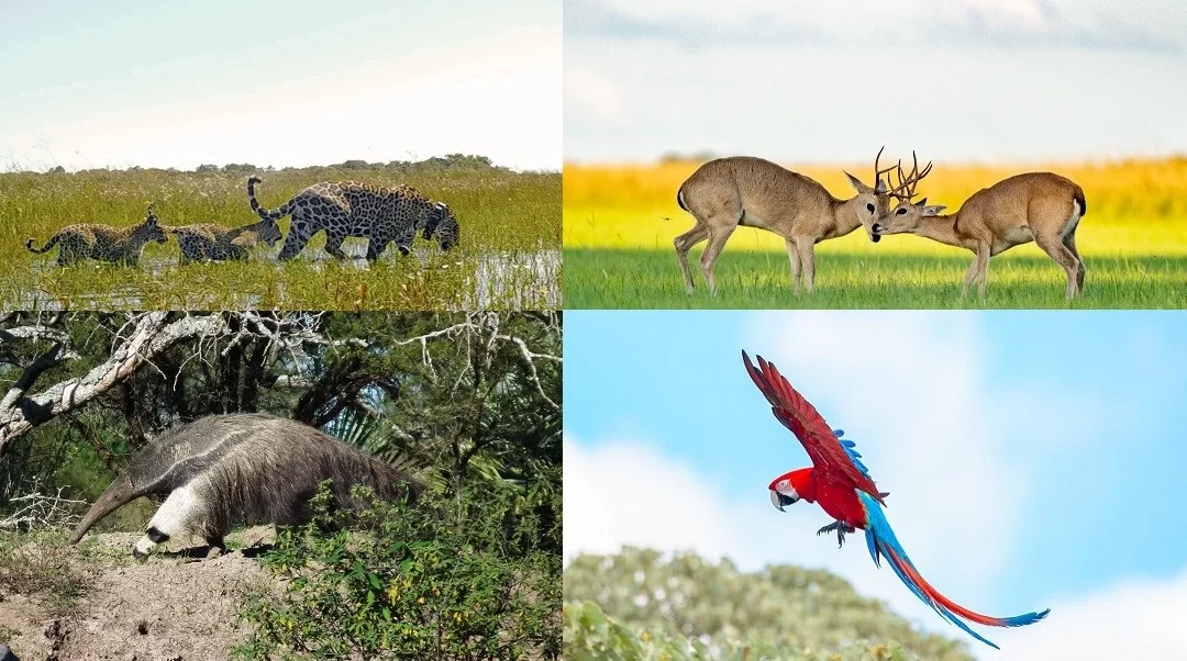 El yaguareté, el venado de las Pampas, el oso hormiguero gigante y el guacamayo rojo, algunas de las especies que están volviendo a poblar Iberá y cuya reintroducción está en riesgo por los incendios. Fotos: Fundación Rewilding Argentina.