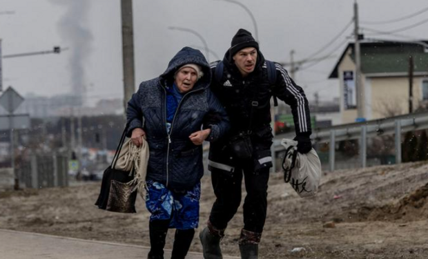 Un hombre ayuda a una anciana a escapar de un fuerte bombardeo en Irpin, cerca de Kiev, Ucrania, el 6 de marzo de 2022. Foto: REUTERS/Carlos Barria