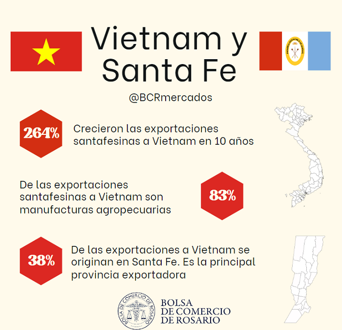 De esta manera, Santa Fe es la provincia argentina que más le exporta a Vietnam. El 38% de los dólares que se generan exportando a este país se originan en Santa Fe, por encima del 24% de Buenos Aires y el 22% de Córdoba.