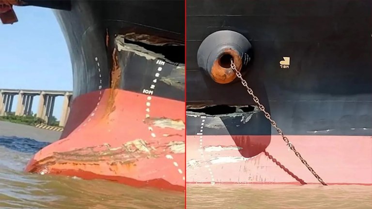 Según puede verse en las imágenes, al pasar por el puente el buque golpeó contra una de las protecciones de los pilotes de la megaestructura. Como consecuencia de ello, se produjo un gran tajo en la proa, a la altura de las anclas.