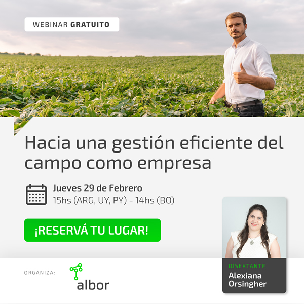 Buenos Aires, viernes 23 de febrero (PR/24) .- Albor, la compañía líder en gestión de sistemas para el agro, invita, el próximo jueves 29 de febrero a las 15 hs. ARG/ UY/ PY – 14 hs. BO, a un nuevo webinar gratuito sobre gestión eficiente del campo como empresa. El mismo estará a cargo de Alexiana Orsingher, contadora y consultora, con más de 8 años de experiencia asesorando a empresas en el ámbito agropecuario, comercial e industrial, haciendo foco en la mejora de los procesos administrativos. Durante el encuentro online, se abarcarán temas como: circuitos de trazabilidad de la información, clasificación de la misma, análisis del negocio y la importancia de los procesos.