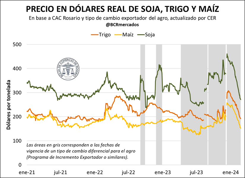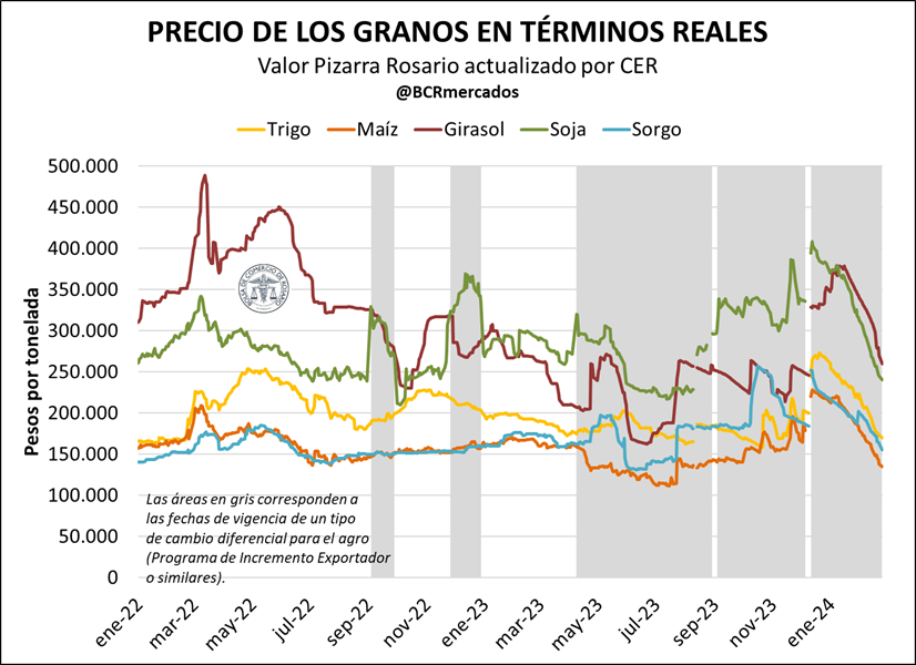 La caída internacional de precios de los commodities agrícolas, que desde el máximo relativo en mayo de 2022 a la fecha cayeron un 50% en el mercado de Chicago, tuvo su correlato en el precio interno de los granos. Siguiendo la cotización real de los granos, según surge de actualizar los valores Cámara por el índice CER (coeficiente de estabilización de referencia), puede observarse que, desde mediados de diciembre a la fecha, el valor en términos reales de la Pizarra Rosario ha caído, en promedio, un 35%. Soja y maíz, en particular, alcanzan los valores más bajos desde agosto de 2023.