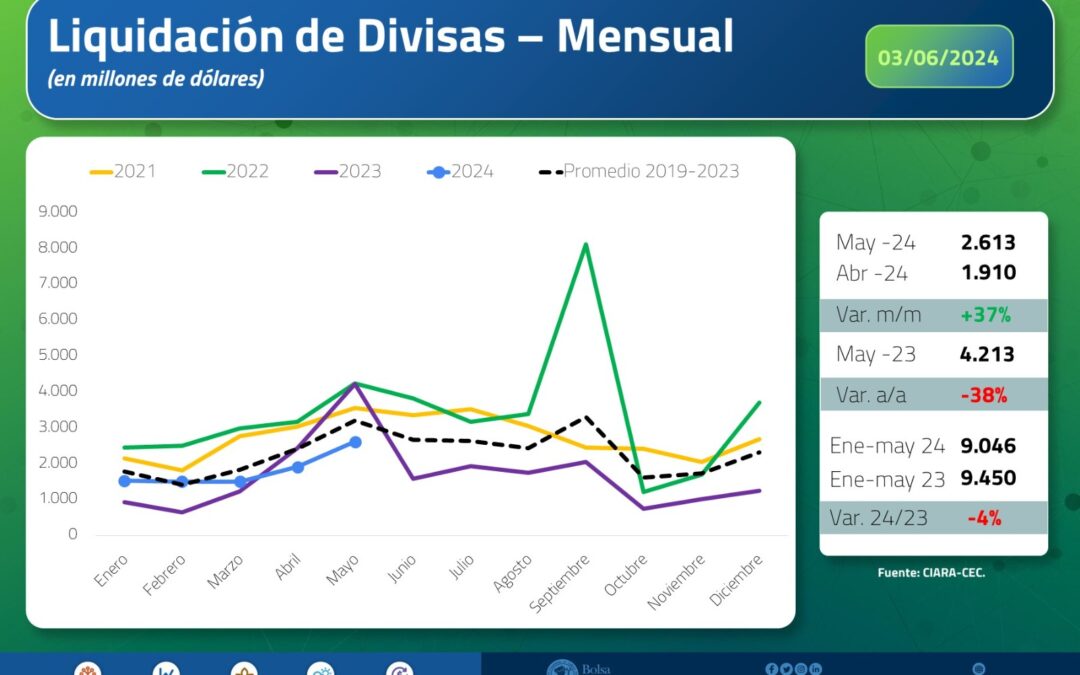En los primeros 5 meses del año, la acumulación de divisas alcanza los USD 9.046, marcando una disminución del 4% en comparación al 2023, finalizó el informe.
