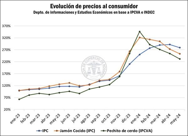 Por el lado de los fiambres, podemos ver que el precio del jamón cocido, cuya evolución mide el INDEC (compone la canasta de bienes cuya evolución mide el Índice de precios al Consumidor), ha tendido a crecer levemente por encima de la inflación de forma casi ininterrumpida desde comienzos de 2023, mostrando un comportamiento similar al precio del Pechito de Cerdo a partir de noviembre, con un registro máximo de 313% interanual en enero, comenzando un paulatino descenso que parece consolidarse en mayo.