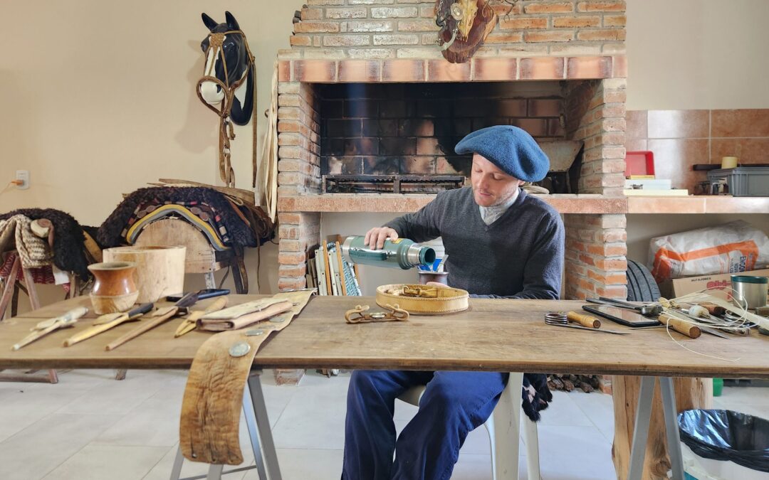 Frente al asador, en su casa, Nicolás tiene un tablón en el que pasa largas horas tejiendo tientos milimétricos de cuero, armando riendas y cortando el cuero para hacer alguna vaina. Suenan zambas y chacareras despacio, y el mate humea mientras algún amigo pasa a saludarlo cuando ve que la ventana está abierta, señal de que está trabajando.