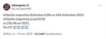 El Gobierno celebró el resultado y se mostró conforme con la evolución lograda durante el primer año de gestión. “Inflación mayorista diciembre 0,8% vs 54% diciembre 2023; Inflación mayorista anual 67,1% vs 276,4% en 2023?, escribió el ministro de Economía, Luis Caputo, en su cuenta de X.