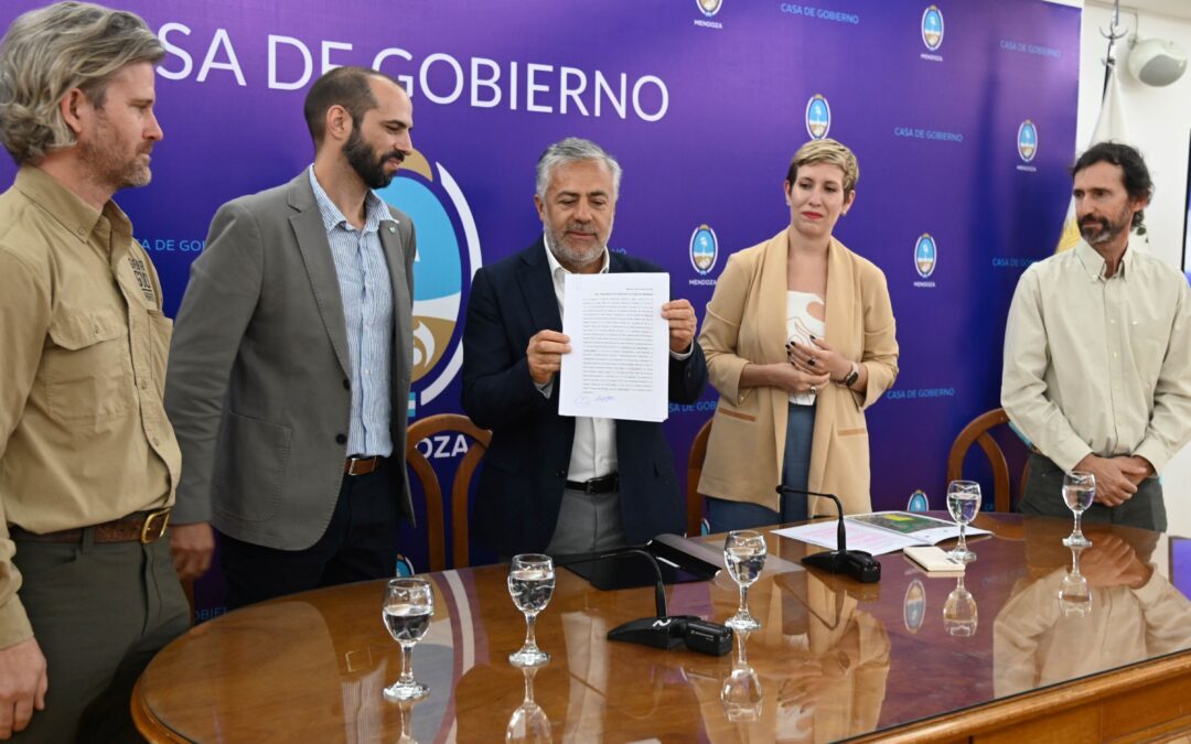 Ciudad de Mendoza, 02 de abril (PR/25) . – En un acto realizado el miércoles 19 de marzo, el gobernador de la provincia de Mendoza, Alfredo Cornejo, recibió la donación de 40 mil hectáreas privadas dentro del Área Natural Protegida La Payunia, ubicada en el departamento de Malargüe. En esta área que se destaca por su deslumbrante paisaje de volcanes y planicies, habita una gran diversidad de especies vegetales y animales autóctonas, como el choique, el zorro colorado, el puma, el gato andino y el cóndor andino. También sucede la mayor migración de guanacos del mundo, una especie que necesita hábitats extensos y conectados para alimentarse y reproducirse, y que gracias a los trabajos de conservación y al mantenimiento de esta área protegida, puede moverse de manera segura.