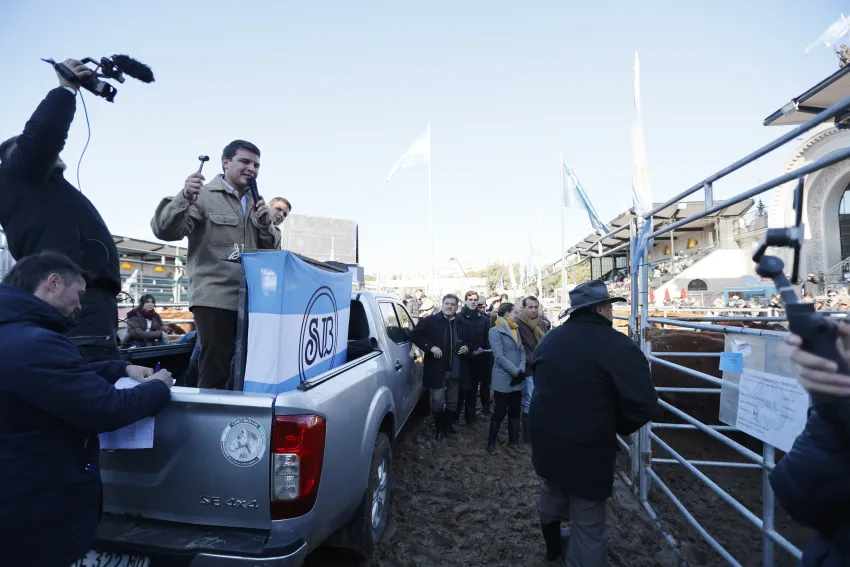 Pasadas las 15.30, desde una camioneta y bajo la pista encharcada, el tío de los jóvenes, Gervasio Sáenz Valiente, dio por comenzado las ventas abriendo el remate con el primer lote y les otorgó el micrófono a sus sobrinos. «Nos pasó el martillo y fue un muy lindo momento», explicó Fernando.