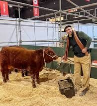Hoy, con orgullo exhibe los dos ejemplares Devon de unos 10 meses en el pabellón ocre de la 137° Exposición de Ganadería, Agricultura e Industria Internacional.
