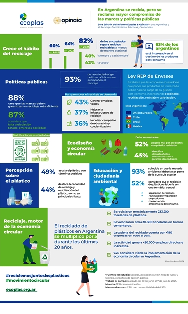 Buenos Aires, viernes 12 de septiembre(PR/ 25) – En Argentina cada vez más personas reciclan, pero sienten que el esfuerzo individual no cuenta con un auténtico respaldo por parte de las marcas y reclaman por más políticas públicas, según la reciente encuesta de opinión realizada por Ecoplas, la asociación civil sin fines de lucro especializada en plásticos y medioambiente, junto con la consultora Opinaia.