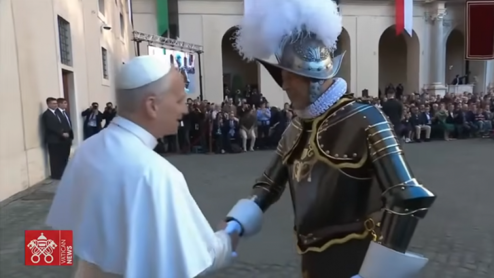 El desfile es solemne, con una marcha lenta por el patio. El comandante rinde homenaje al Papa, agradeciéndole que comparta este ritual. Es la fiesta de San Francisco de Asís, una figura que, subraya el coronel Graf, muestra dónde reside la verdadera grandeza: «No reside en la riqueza ni en el poder, sino en la humildad, la sencillez y el amor a todas las criaturas».