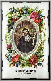 - Santa Irmina de Tréveris: Abadesa benedictina de los siglos VII y VIII, hija del rey Dagoberto, que ayudó a la evangelización de Frisia.