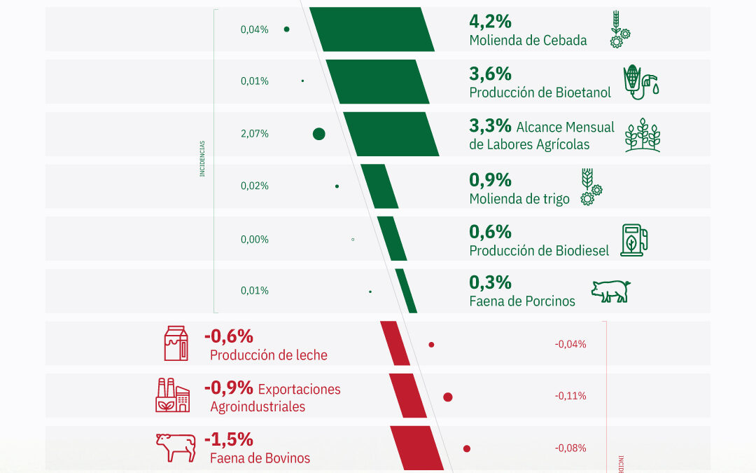 Entre los componentes con subas mensuales, se destacó el avance de labores agrícolas, con un incremento del 3,3%. También se observaron aumentos en la molienda de trigo (0,9%) y de cebada (4,2%), junto con una suba del 3,6% en la producción de bioetanol y del 0,6% en la elaboración de biodiesel. La faena de porcinos, por su parte, mostró un aumento mensual del 0,3%.