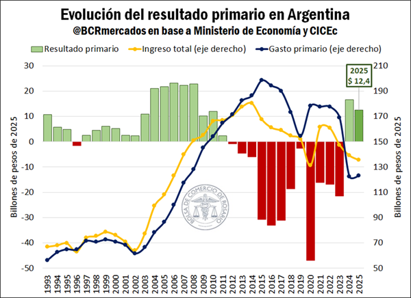 Con un ingreso total de $ 135,4 billones y egresos por $ 123 billones, Argentina logró en 2025 registrar un superávit fiscal por $ 12,4 billones, medido en pesos constantes de 2025.