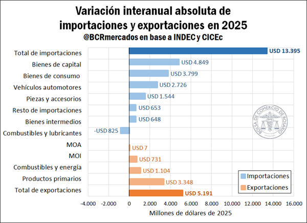 Por su parte, las importaciones de bienes ascendieron a U$S 75.788 millones, marcando un crecimiento real del 21,5% interanual. Analizando los datos por uso económico, se destaca el crecimiento en las compras externas de bienes de capital, que registraron un aumento del 47,4% en comparación a 2024. Adicionalmente, los bienes de consumo experimentaron un incremento interanual del 50%, en tanto se importó un 92,6% más de vehículos automotores de pasajeros. Por el contrario, se registró una caída interanual real del 20,1% en las importaciones de combustibles y lubricantes.