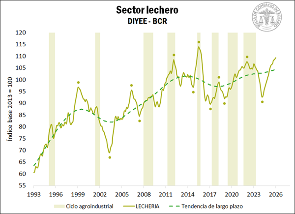 En lo que respecta al sector lechero, el mes de enero arrojó una variación mensual positiva del 0,4%, hilando 22 meses consecutivos al alza. De esta manera, la producción de leche inició el año manteniendo la tendencia alcista, luego de la fuerte expansión registrada en 2025 que dejó una base productiva sólida para el comienzo de 2026. De hecho, desde el inicio de la serie en 1983, es el cuarto mejor enero del que se tenga registro.