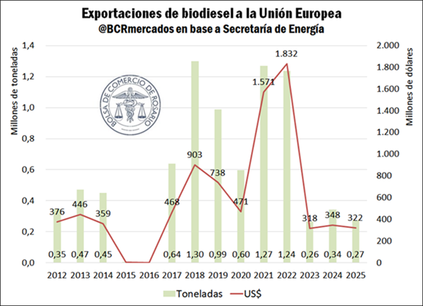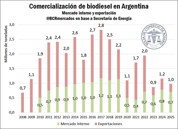 Sin embargo, con la menor demanda externa la participación de la exportación cayó al 33% del total producido en 2023 y 2024. No conforme con ello, dicha participación concluyó el 2025 con apenas el 28% del biodiesel del país producido para exportar, un mínimo histórico.