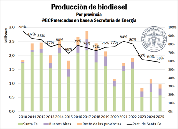 Particularmente, la provincia de Santa Fe marca una caída notable de producción y a la vez pérdida de participación. Esto se explica porque, además de sufrir las consecuencias de la baja de la tasa de corte, es en el Up River donde se concentra la infraestructura exportadora del biodiesel argentino. Más allá de ello, la provincia de Santa Fe representó el año pasado el 58% de la producción de biodiesel del país.