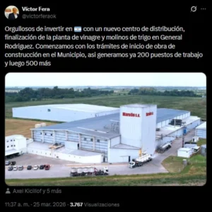 “Orgullosos de invertir en Argentina con un nuevo centro de distribución, finalización de la planta de vinagre y molinos de trigo en General Rodríguez. Comenzamos con los trámites de inicio de obra de construcción en el Municipio, así generamos ya 200 puestos de trabajo y luego 500 más”, escribió en su red social X para dar a conocer la noticia.