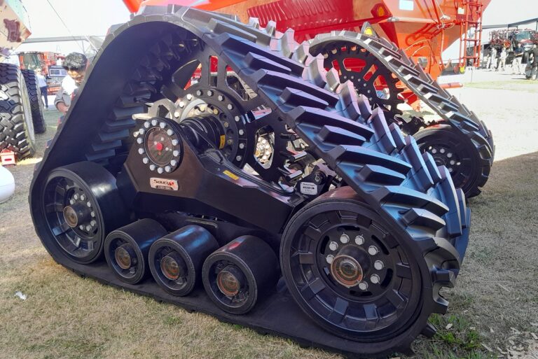 También exhibió el modelo S-TECH 1000 G para cosechadoras, con ancho de 914 mm y 3,68 m² de superficie de contacto para cosechar aún en suelos blandos.