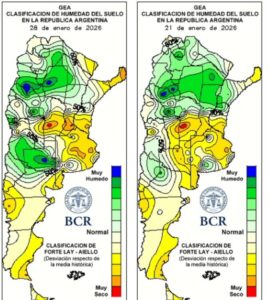Mientras tanto, el clima está siendo una de las claves a seguir para la oferta de la nueva. La ausencia de precipitaciones significativas y elevadas temperaturas de principios de este año han generado complicaciones en algunos lotes. Si bien buena parte de la soja de primera y segunda están en condiciones buenas a muy buenas, comienzan a aparecer delegaciones que SAGyP releva en condiciones regulares. Al tiempo que el sur de Buenos Aires, el oeste de Córdoba, gran parte de La Pampa y Entre Ríos están mostrando condiciones de sequía.