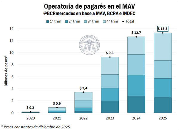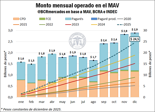 El Mercado Argentino de Valores (MAV) cerró 2025 con un récord histórico de $24,5 billones operados, un 30% más que el año previo, impulsado principalmente por pagarés y cheques de pago diferido en un contexto de mayor protagonismo del financiamiento en pesos.