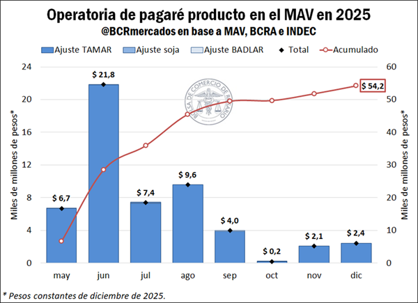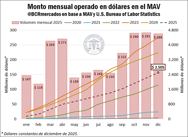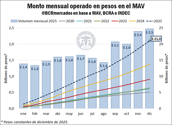 Cabe aclarar que el análisis realizado en este apartado considera el volumen total negociado en el MAV, expresando todos los guarismos en pesos constantes de diciembre de 2025, es decir, aislando el efecto del incremento de precios.