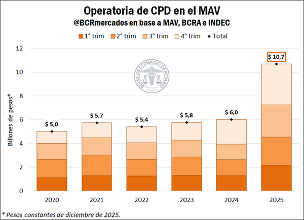 En lo que respecta a los CPD, el monto operado a través de este instrumento en el MAV ascendió a un total de $ 10,7 billones durante 2025, registrando un sólido incremento del 78% respecto de 2024 y casi duplicando el valor promedio de los cinco años previos (+91%). Diferenciando por mes, se evidencia que en noviembre se negoció un volumen de $ 1,2 billones, siendo el mayor monto mensual operado a través de este instrumento del que se tiene registro.