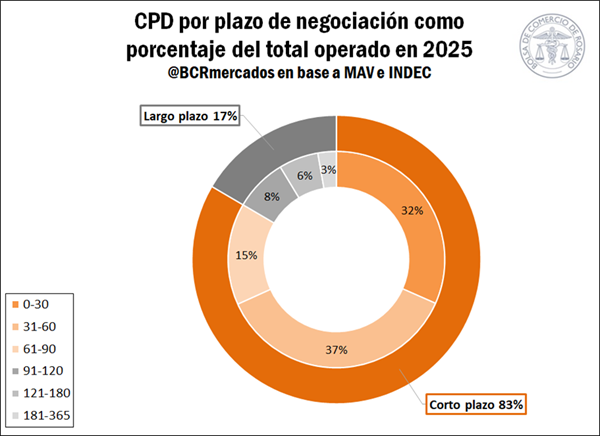 Por su parte, analizando la evolución en los plazos de negociación, se advierte que los instrumentos con plazo de 31 a 60 días explicaron la mayor proporción de operaciones de CPD, dando cuenta del 37% del monto negociado. Los instrumentos con plazo de 0 a 30 días explicaron el 32% del total, en tanto los de 61 a 90 días, el 15%. En conjunto, estos instrumentos de corto plazo representaron el 83% de los CPD operados en 2025. Mientras tanto, los instrumentos con plazo de 91 a 120 días y de 121 a 180 días representaron el 8% y el 6% del volumen operado, respectivamente, mientras que los CPD con plazo de 181 a 365 días tuvieron una participación de apenas el 3%. De esta manera, los instrumentos de largo plazo dieron cuenta de tan sólo el 17% del valor negociado de CPD.