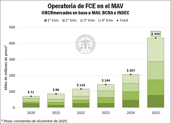 Por su parte, las FCE fueron el instrumento que mostró un mayor crecimiento en pesos, cuyo volumen logró casi triplicarse en comparación con el mismo período del año anterior (+171%). De esta manera, las FCE en pesos totalizaron $ 394.000 millones durante 2025, dando cuenta del 2% de las operaciones en moneda local. Finalmente, los pagarés a la vista explicaron apenas el 0,3% de las operaciones en pesos, con operaciones por $ 54.200 millones.