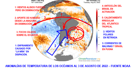 Buenos Aires, 22 agosto (PR/22) — La aparición de focos cálidos sobre el Pacífico Ecuatorial, reduciendo el riesgo de un tercer episodio de “La Niña”, así como una gradual reactivación de las precipitaciones, la moderación de la intensidad de las irrupciones de aire polar, la vigorización del anticiclón de las costas del Brasil y el avance hacia el Sur de la corriente marina cálida del Brasil, fortalecen la posibilidad de una marcha climática tendiente a la normalidad, a la que puede adjudicarse una probabilidad de ocurrencia en el orden del 80 %.