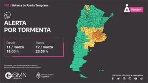 Buenos Aires, martes 12 marzo (PR/24) — Se mantiene el mal clima en buena parte del país, y por eso el Servicio Meteorológico Nacional (SMN) volvió a emitir alertas por tormentas fuertes que podrían incluir caída de granizo y ráfagas de viento.