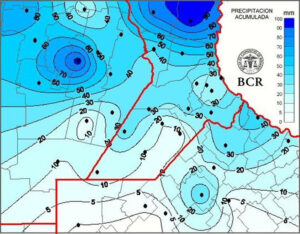 Los valores más elevados se registraron en Irigoyen, con 90,4 milímetros, e Idiazábal, con 82,2 milímetros. También se destacan Carlos Pellegrini, con 84,4 milímetros, y Colonia Almada, con 66 milímetros. En la localidad de Ramallo, en tanto, se registraron 46,6 milímetros. “Lo más importante quedó desde el centro de la región núcleo hacia el norte. Esta vez, las tormentas más importantes se observan por encima de la línea horizontal que cruza a Rosario”, señaló Russo.