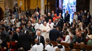 Al entrar en la iglesia, el Papa se detuvo en adoración al Santísimo Sacramento. Para darle la bienvenida, el coro londinense «The Gradualia Consort» cantó el himno «Tu es Petrus».
