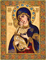Es significativo que las iconografías tradicionales de esas Iglesias, vinculadas a los Concilios de Éfeso y Calcedonia, representen a María mayoritariamente como «Theotókos»,[16] y fuesen creadas para contemplar en ellas a la Virgen-Madre que presenta al mundo y abraza a su Hijo, el niño Jesús, mientras intercede por la humanidad ante su Hijo. Así, la iconografía mariana oriental, como kerygma y recordatorio visual de la teología de los primeros concilios y de los Santos Padres a todo color, quiere ser una traducción visual de los títulos específicos que se aplican a la Virgen.[17] Por eso los íconos tienen que “leerse” desde la liturgia y desde los himnos. María no es objeto de un culto que viene colocado junto a Cristo, sino que se inserta en el misterio de Cristo a través de la Encarnación.[18] Ella es el ícono en el que se venera a Cristo mismo. Ella es la Theotókos, la Virgen Madre que presenta a su hijo Jesús, el Cristo, y es, al mismo tiempo, la Odēgētria que muestra, señalando con su mano, el único Camino que es Cristo.