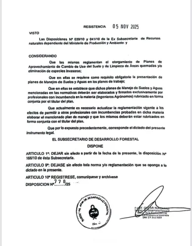 Chaco, jueves 13 noviembre (PR/25) — El Consejo Profesional de Ingenieros Agrónomos del Chaco (CPIACH) manifestó su preocupación por la reciente Disposición N° 778/25, dictada por la Subsecretaría de Desarrollo Forestal del Ministerio de Producción y Desarrollo Económico Sostenible. La norma deja sin efecto la histórica Disposición N° 166/10 y elimina la exigencia de que los Planes de Manejo de Suelos y Aguas sean elaborados y firmados exclusivamente por Ingenieros Agrónomos.