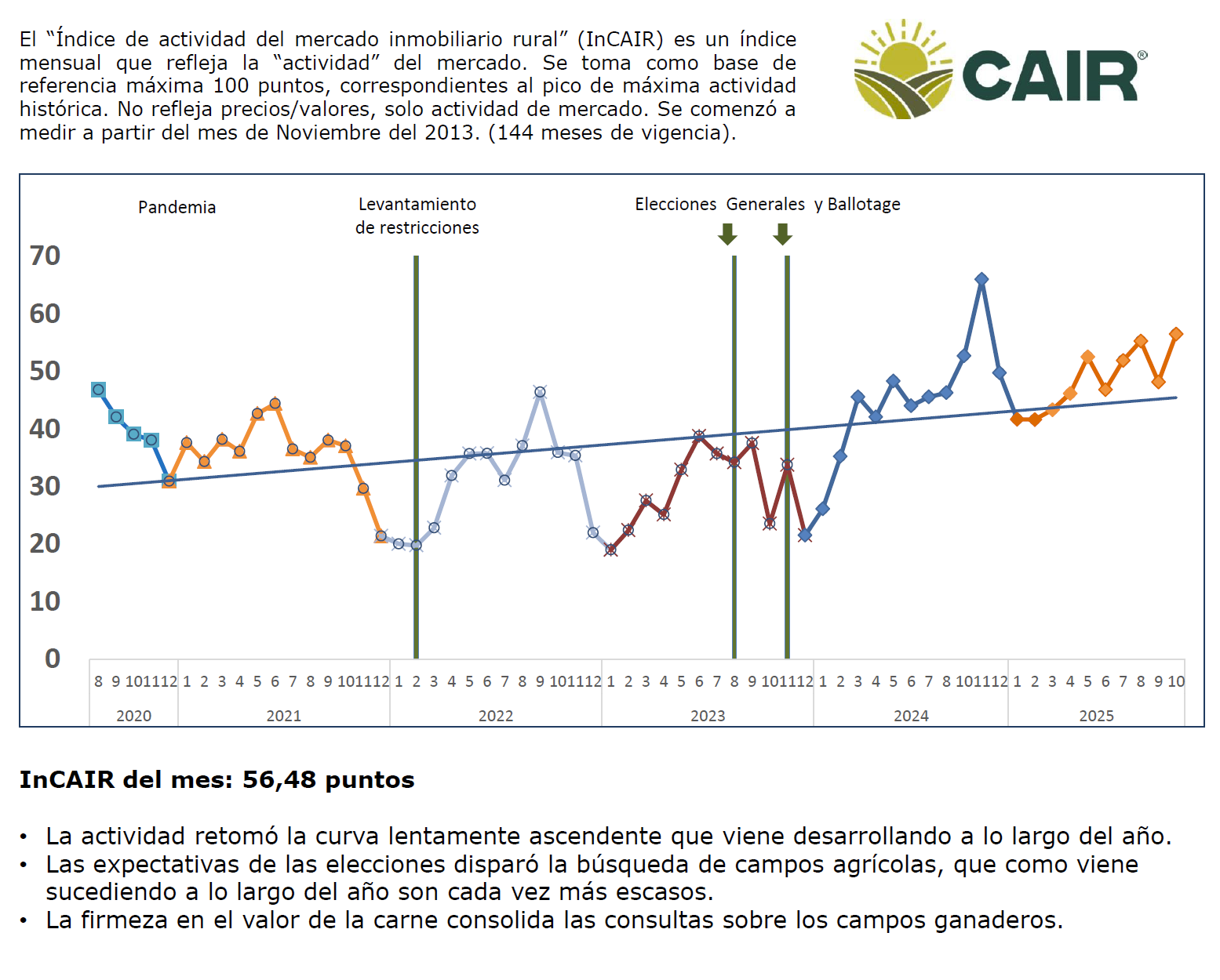 Buenos Aires, viernes 21 noviembre (PR/25) — Las expectativas de las elecciones de octubre dispararon la búsqueda de campos agrícolas, según consignó la Cámara Argentina de Inmobiliarias Rurales (CAIR) que publicó una vez más y en alza el Índice de Actividad del Mercado Inmobiliario Rural (InCAIR).