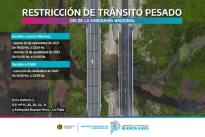 Tras la resolución del Gobierno nacional de generar cuatro días para el descanso y favorecer al turismo, la Dirección de Vialidad de la Provincia de Buenos Aires, dependiente del Ministerio de Infraestructura y Servicios Públicos, con el fin de facilitar el desplazamiento de vehículos y contribuir a la prevención de siniestros de tránsito en rutas claves para el turismo de cercanía, restringe la circulación de camiones de siete toneladas en bruto.