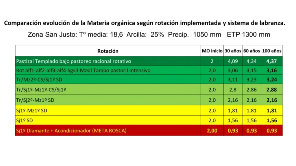 A partir de ensayos a campo y simulaciones con el modelo AMG, los ingenieros evaluaron distintos sistemas de manejo en la región de Gálvez y San Justo. Los datos obtenidos en el establecimiento LOS PICCOS, en Pueblo San Bernardo (Comuna Tres Reyes), mostraron que, tras 35 años de agricultura continua bajo siembra directa, la MOS se mantuvo estable en 3%, demostrando la viabilidad del manejo conservacionista.