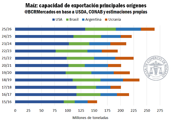 De materializarse a principios del año que viene las enormes gestas productivas en Argentina y Brasil, la capacidad de exportación del grupo de los cuatro principales exportadores se incrementaría en 20% respecto a la campaña previa, alcanzando la elevada cifra de 264 Mt que podrían llegar a embarcarse luego de abordadas las necesidades internas. Contrastando contra la demanda, sacando a China de la ecuación, los stocks finales a nivel global esperados por el USDA, con una proyección aún conservadora sobre la cosecha argentina para la próxima campaña, se incrementarían en un 8% alcanzando la cifra más alta en seis años, a pesar del aumento en el consumo.