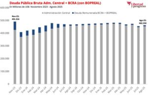 En números, Libertad y Progreso detalla que, comparando de manera homogénea los pasivos del Estado nacional, en agosto de 2025 la deuda era 29.086 millones de dólares menor que en noviembre de 2023.