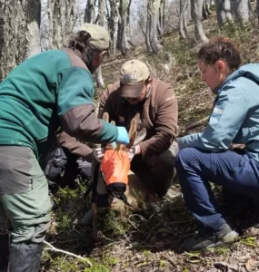 Un equipo conformado por personal de la Administración de Parques Nacionales (APN), la Fundación Huilo Huilo (RBHH) de Chile y Fundación Rewilding Argentina logró capturar a este ejemplar de huemul (Hippocamelus bisulcus) en la zona norte de la mencionada área protegida para reemplazar su collar transmisor y poder continuar así su seguimiento satelital.