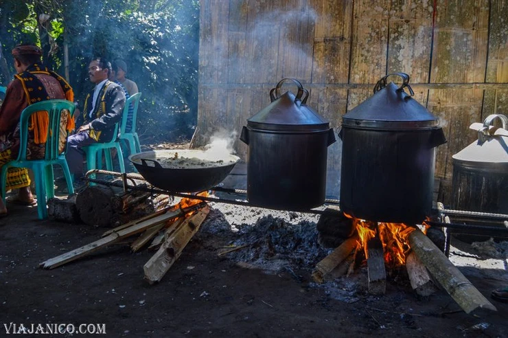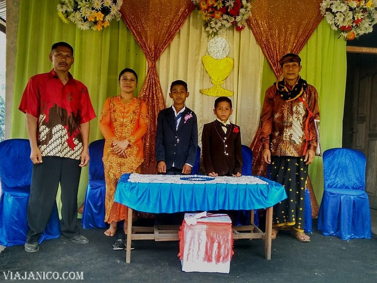 Desde Bajawa partí para Ende, mi última parada en Flores, pero en el camino me llevé una linda sorpresa. El hombre que me levantó en la ruta me dijo que tenía que parar en un pueblo a saludar a un amigo, pero resultó ser que era la comunión del hijo y por lo tanto ese domingo el pueblito entero estaba reunido celebrando. Cuando llegamos, tanto la familia con sus típicos trajes tradicionales como los invitados se acercaban deseosos de saludarme y recibirme. Me ofrecieron té, café, torta, jugo de palmera y mucha comida. Desde niñas pequeñas hasta las matriarcas, todas colaboraban con la preparación del menú. Es que ese día tenían que alimentar a todo el pueblito y para ello habían sacrificado una vaca.